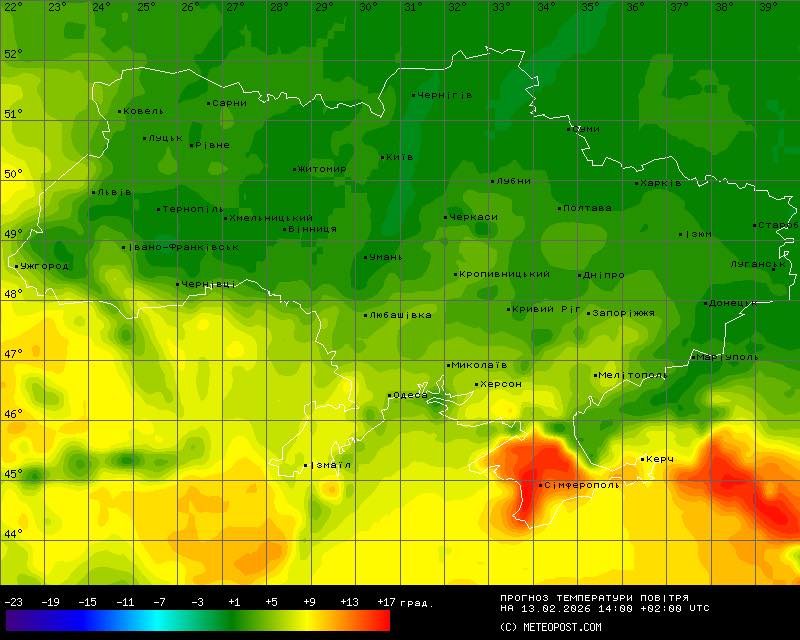 “13-го лютого температура повітря вночі -2+3 градуси, протягом дня п’ятниці передбачається +2+5 градусів, на півдні +5+9, в Криму +10+15 градусів! Карта внизу.