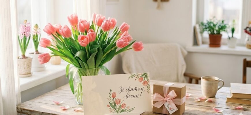 Вітаю з 8 Березня! Бажаю весняного настрою, тепла в серці, щирих посмішок і гармонії в душі. Нехай у житті буде багато радості, любові, приємних моментів і здійснених мрій. Нехай кожен день дарує натхнення та щастя!