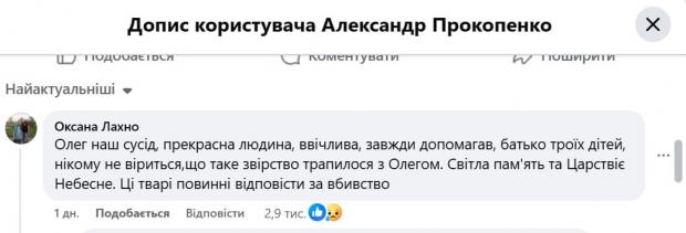 У коментарі під дописом Прокопенка користувачка Оксана Лахно, яка назвалася сусідкою загиблого, зазначила, що в чоловіка було троє дітей.