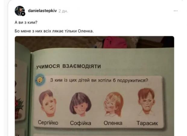 Мама першокласника Даніела Степків поділилася фото з підручника з дивним зображеннями дітей. Усі вони мали різні вирази обличчя і спантеличили українців. У дописі у Тhreads жінка зазначила, що її найбільше лякає дівчина з ім’ям Оленка, яка мала дивну усмішку, передають Патріоти України.