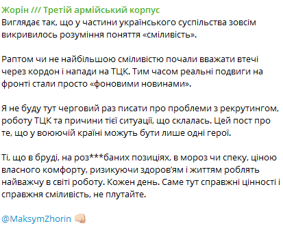 «Я не буду тут черговий раз писати про проблеми з рекрутингом, роботу ТЦК та причини тієї ситуації, що склалась. Цей пост про те, що у воюючій країні можуть бути лише одні герої. Ті, що в бруді, на роз***аних позиціях, в мороз чи спеку, ціною власного комфорту, ризикуючи здоровʼям і життям роблять найважчу в світі роботу. Кожен день. Саме тут справжні цінності і справжня сміливість, не плутайте», — наголосив військовий.