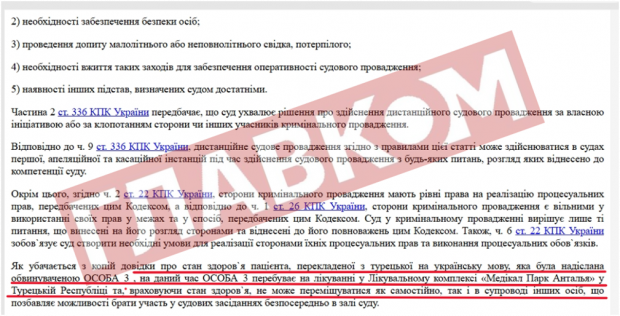 Суд погодився на такий формат розгляду справи після клопотання адвоката. У документі зазначено, що Дроздова лікується у медичному комплексі Medical Park Antalya та «не може пересуватися». До клопотання вона додала копії медичних документів і договір оренди житла.