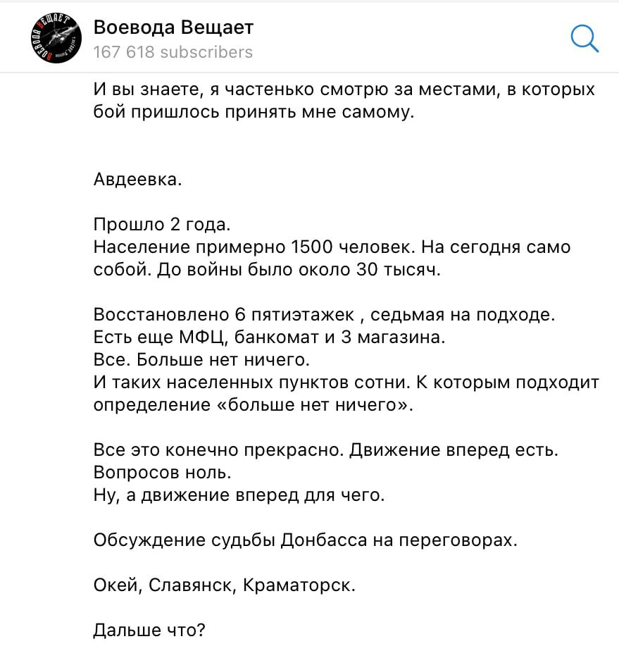 Автор каналу пише, що в Авдіївці, де до війни жило близько 30 тисяч людей, зараз залишилося приблизно 1500. За його словами, за два роки там відновили лише шість п’ятиповерхівок, ще одну готують, а з інфраструктури працюють МФЦ, банкомат та три магазини.