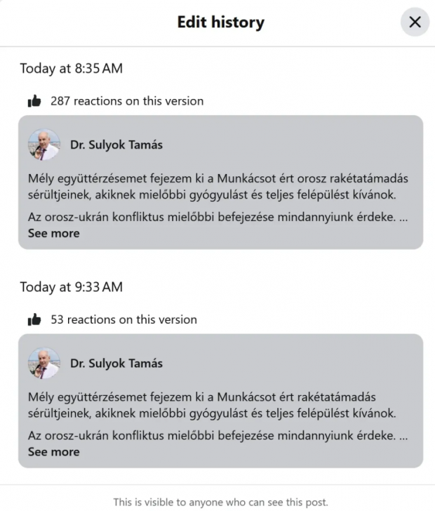 Президент Угорщини Тамаш Шуйок у дописі у Facebook висловив співчуття постраждалим внаслідок російської атаки на Мукачево. Проте менш ніж за годину він відредагував пост: замість російського ракетного удару у дописі тепер написано просто «ракетний удар». Про це пише угорське видання Telex, передають Патріоти України.