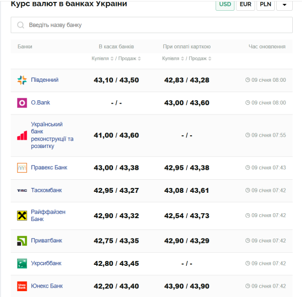На сьогодні, 9 січня, курс валют в Україні такий: