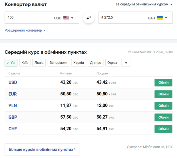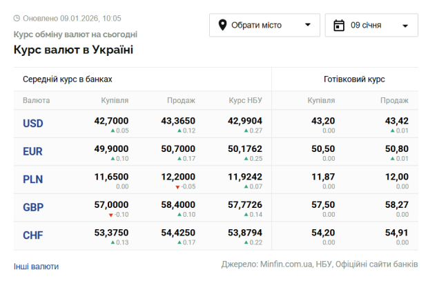 Курс валют в Україні станом на 9 січня 2026 року