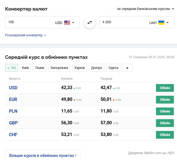 На сьогодні, 5 січня, курс валют в Україні такий: