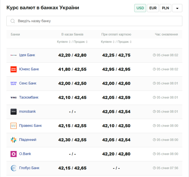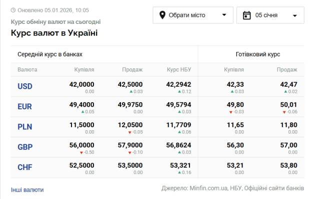 На сьогодні, 5 січня, курс валют в Україні такий: