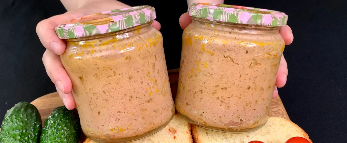 Все ретельно перемішуємо до однорідності і викладаємо паштет у чисті стерилізовані підготовлені банки, залишивши зверху 1 см.