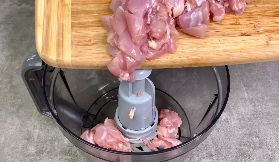Курку довільно подрібнюємо та пропускаємо через м’ясорубку чи блендер, потім викладаємо у чисту миску.