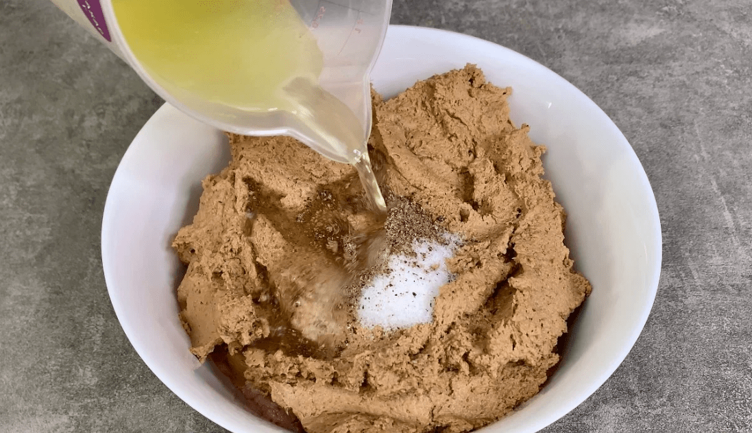 У масу додаємо сіль, мускатний горіх, чорний мелений перець та кілька половників процідженого бульйону, в якому варилися сердечки.