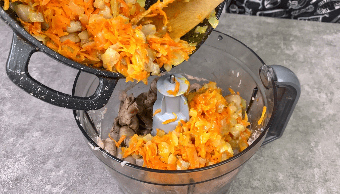 У блендері перемелюємо відварені субпродукти та піджарювання, після чого з’єднуємо з курячим фаршем.