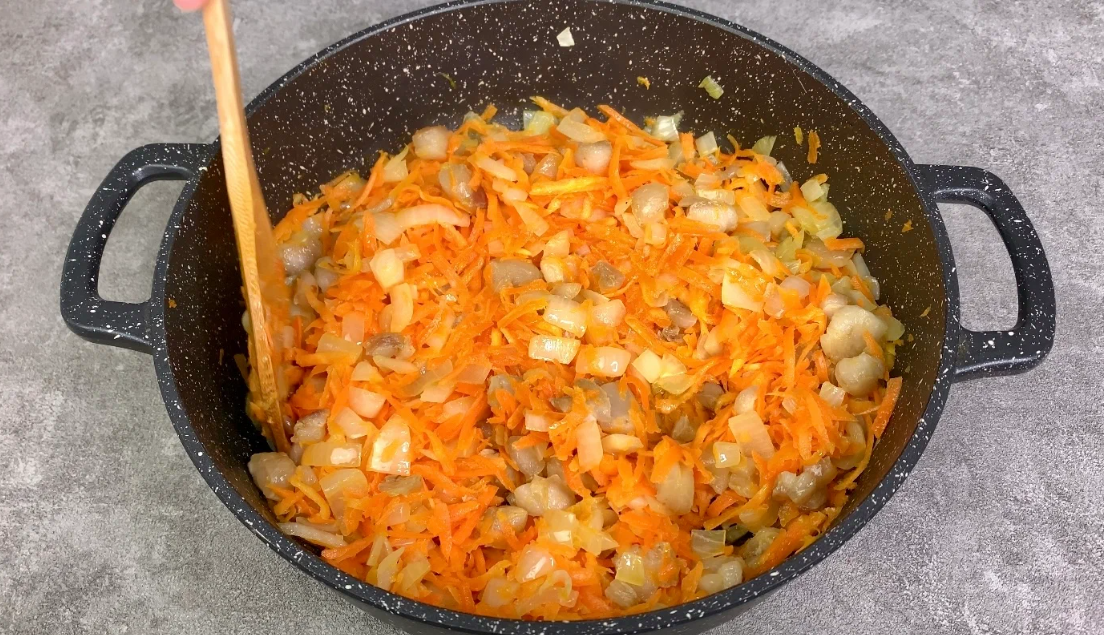 Тонке сало ріжемо дрібним кубиком, обсмажуємо в сковороді кілька хвилин, потім додаємо цибулю кубиком, змащуємо ще 3-4 хвилини, всипаємо терту моркву і готуємо все разом ще близько 7 хвилин. Готову засмажку потрібно повністю остудити.