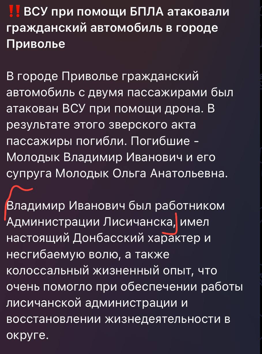 Росіяни стверджують, що удару нібито було завдано “дроном ЗСУ”. Внаслідок атаки помер співробітник окупаційної “адміністрації” міста Лисичанська Володимир Молодик. Загинула також його дружина.