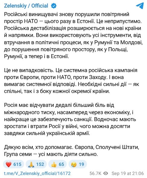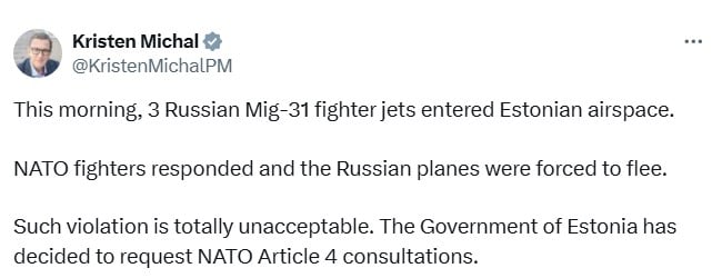 Естонія активувала 4-ту статтю Північноатлантичного договору, яка передбачає консультації союзників, коли одна з країн блоку вважає, що її територіальна цілісність, незалежність чи безпека перебувають під загрозою. На такий крок Таллін пішов після сьогоднішнього вторгнення російських винищувачів “МіГ-31К” до естонського повітряного простору.