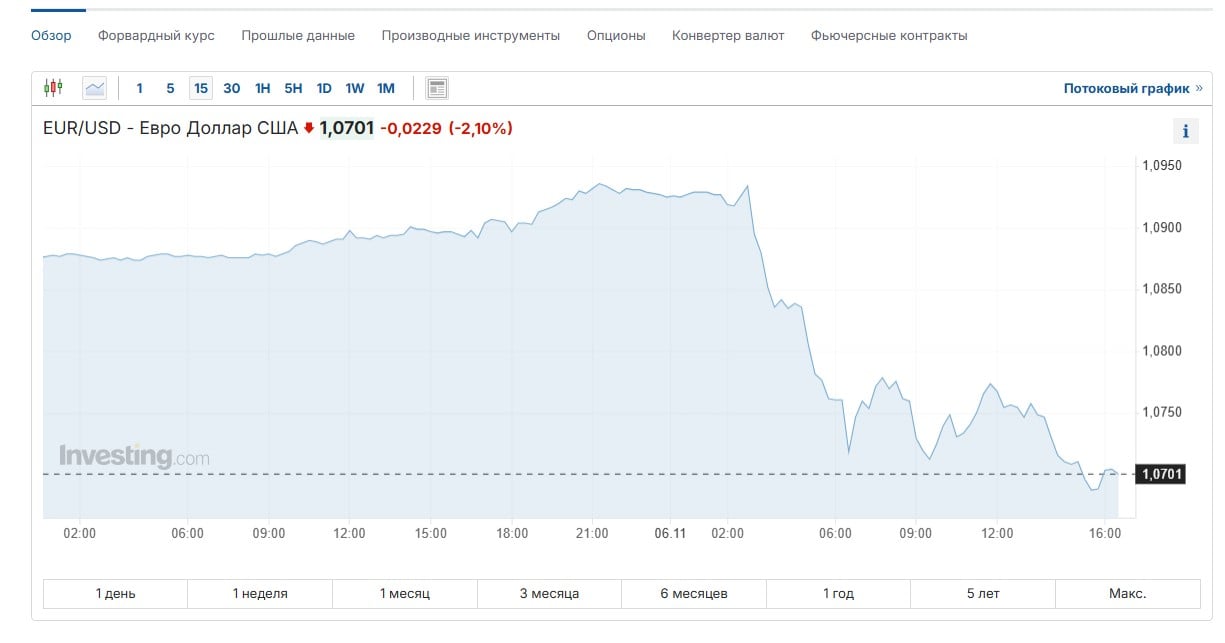 Євро падає через ймовірне повернення Трампа до Овального кабінету. Під час передвиборчої кампанії республіканець обіцяв запровадити мито на європейську продукцію.