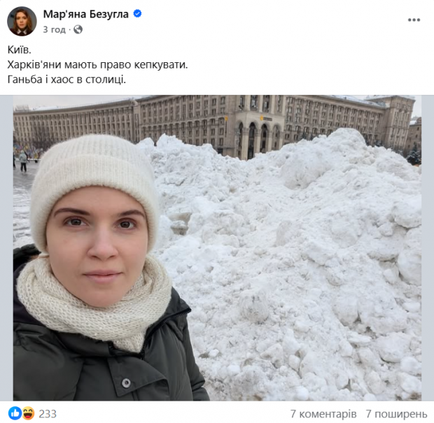 «Київ. Харків’яни мають право кепкувати. Ганьба і хаос в столиці», – написала Безугла.