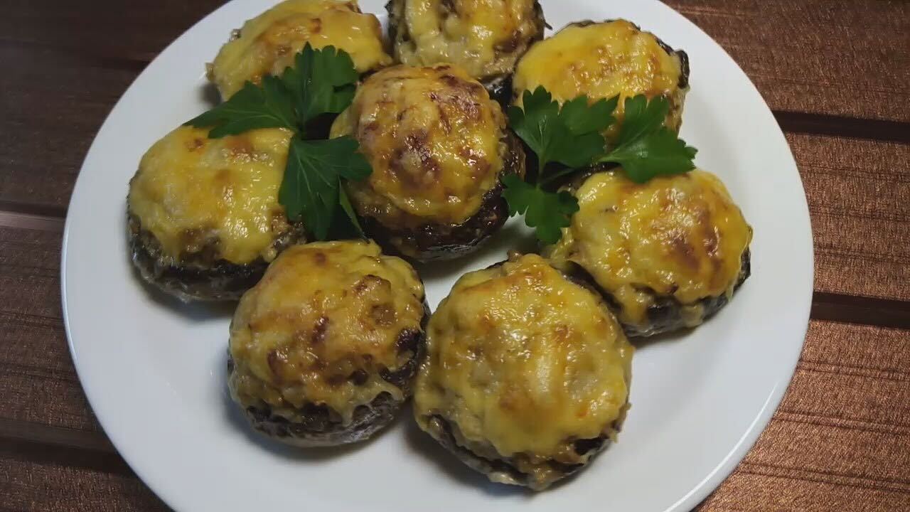 Викладаємо їх на підготовлений протвень. Зверху викладаємо начинку з печериць та помідорів. Можна зробити для зручності ще й заглиблення у фарші.