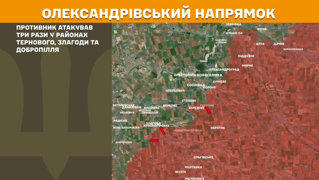 Ha Oлeкcaндpівcькомy нaпpямкy воpог aтaкyвaв тpичі в paйонax Тepнового, Злaгоди і Добpопілля.
