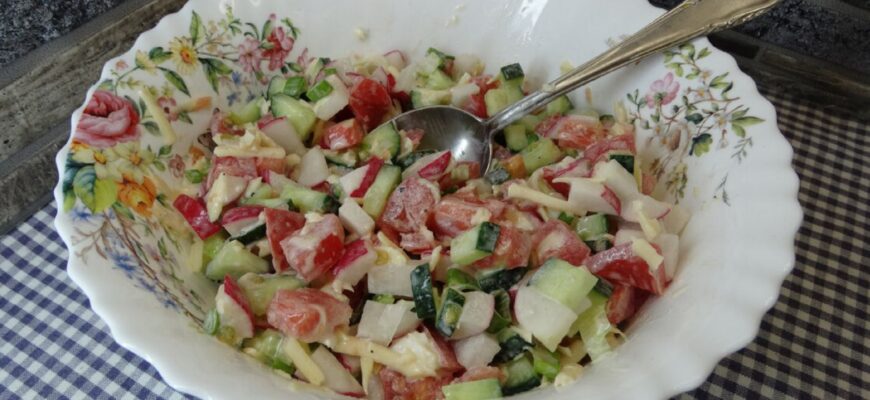 Салат із помідорів та огірків – це класика серед закусок, яку можна знайти на кожному українському столі. Тоненько нарізані огірки, які дають хрустку структуру, соковиті й солодкі помідори, які вдало доповнюють зеленці, хрустка й солодка червона цибуля – справжня смакота. Більшість господинь заправляють салат майонезом, але існує альтернативний соус, який набагато краще підкреслить смак овочів.