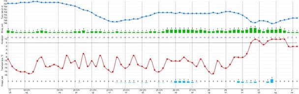 Судячи з цього довгострокового прогнозу, 31 січня та 1 лютого повітря в столиці нарешті буде прогріватися до плюсових значень.