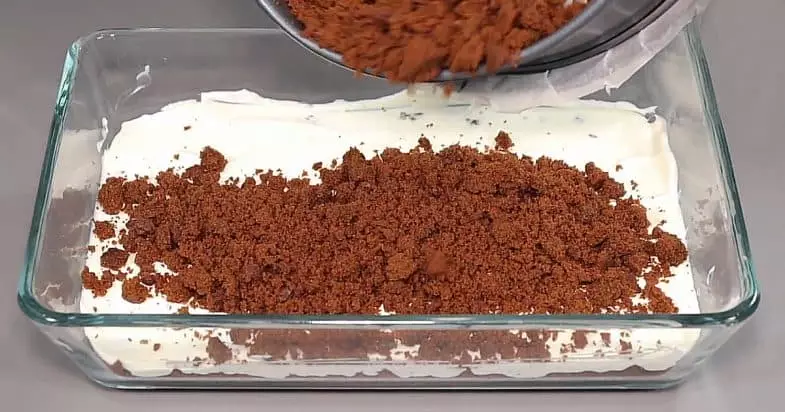 Тепер викладаю у форму на крихту рівномірно половину крему. Далі на крем висипаю крихту, що залишилася, розрівнюю її і роблю другий шар крему. Ставлю торт у холодильник.