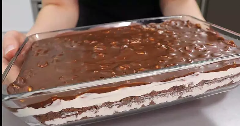 До шоколаду вливаю олію, розтоплюю або на водяній бані, або в мікрохвильовій печі. Перемішую, висипаю обсмажений арахіс. Глазур охолоджую і виливаю поверх крему, ставлю торт у холодильник на 2 години. Цей торт неймовірно смачний!