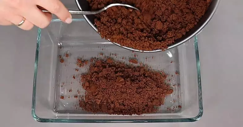 Тепер дістаю з духовки і залишаю повністю охолонути у формі. Виймаючи з форми, перетворюю бісквіт руками на крихту. Беру прямокутну скляну форму в якій буду збирати тортик, першим шаром висипаю половину крихти. Злегка утрамбовую ложкою.