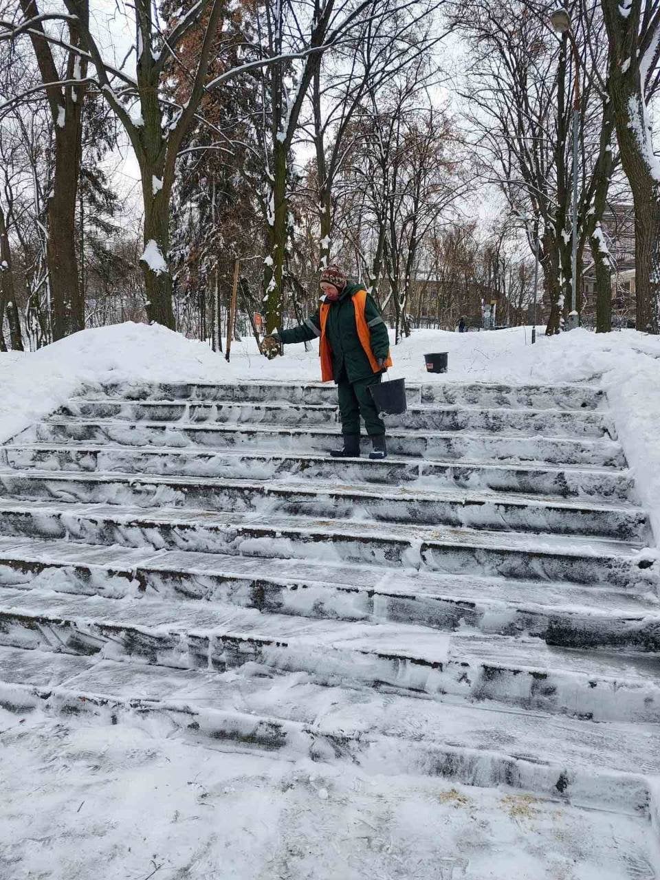 Першочергово обробляють магістралі, мости, спуски та підйоми. У парках і скверах працюють «зеленбудівці».