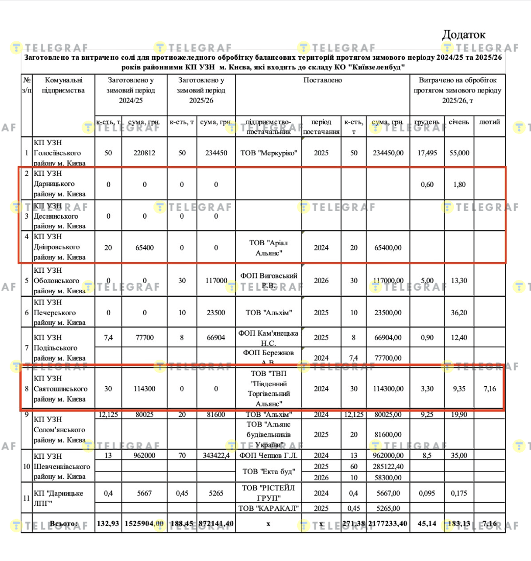 Згідно з документами Київради, які опинилися у розпорядженні ЗМІ, щонайменше чотири райони столиці провалили підготовку до зими 2025/2026 років у частині закупівлі протиожеледних реагентів. Дарницький та Деснянський райони взагалі не закупили технічну сіль. А Дніпровський та Святошинський райони також не проводили закупівлі цього сезону, хоча частково використовували залишки.