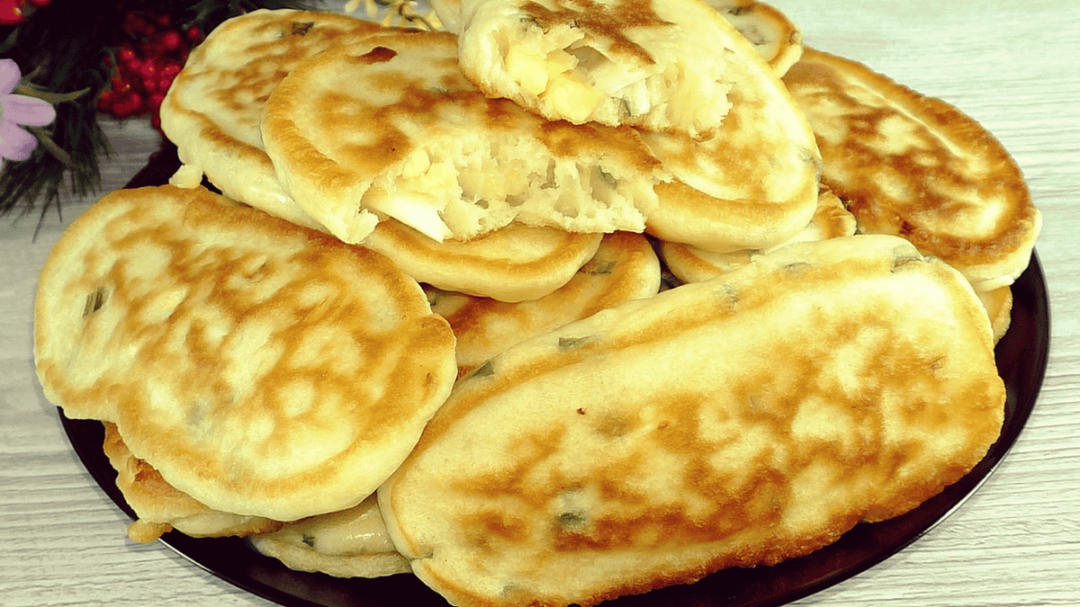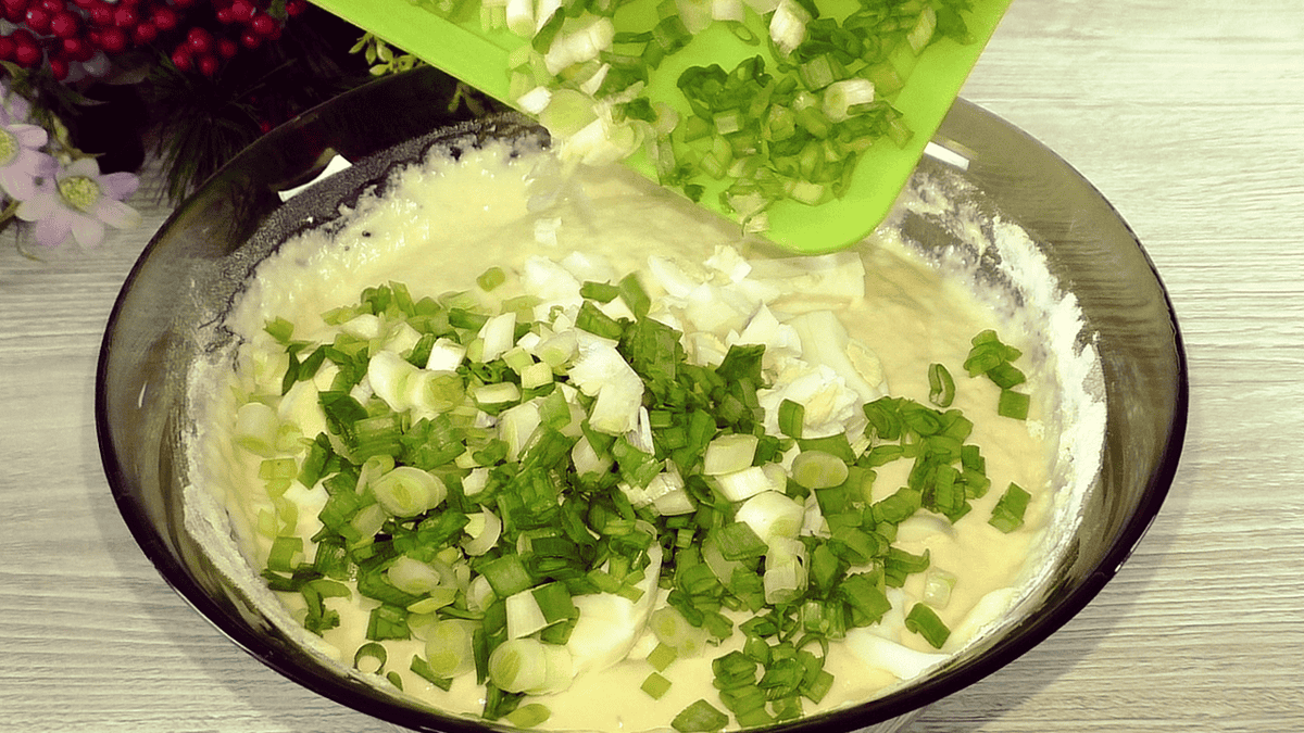Прямо в тісто додаю начинку. У мене зелена цибуля та варені яйця. Якщо їсти сир можна додати, буде ще смачніше.