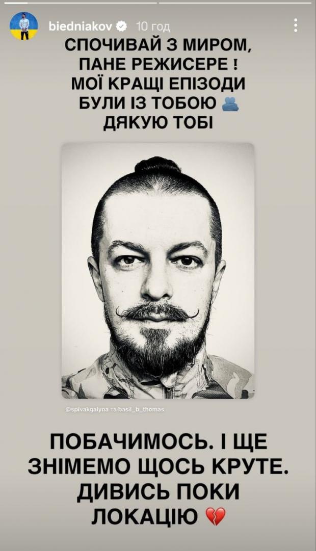 Загинув 45-річний Хомко ще місяць тому – 2 жовтня. Однак про трагічну звістку повідомили лише зараз. “Спочивай із миром, пане режисере! Мої кращі епізоди були з тобою. Дякую тобі, – написав Бєдняков. – Побачимося і ще знімемо щось круте. Дивися поки локацію”.