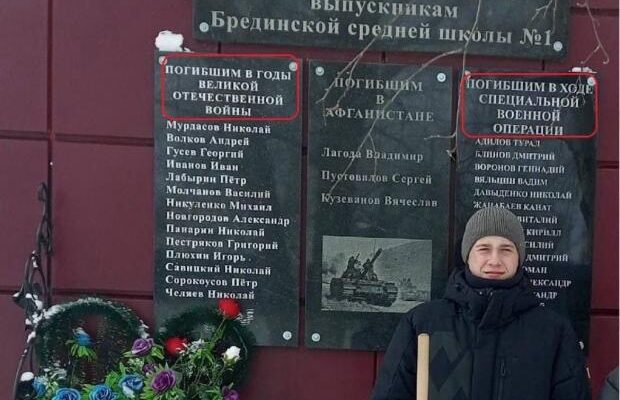 На меморіалі вказані імена загиблих у так званій «спеціальній військовій операції». Порівняння з історичними даними про випускників, які загинули під час Великої Вітчизняної війни, демонструє разючий масштаб втрат, навіть на рівні одного невеликого населеного пункту.
