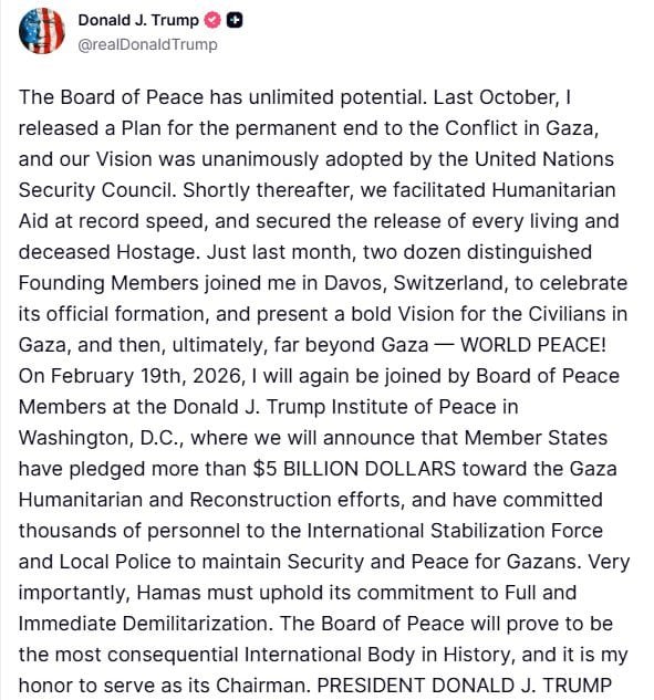 У своїй публікації президент США наголосив, що Рада миру має необмежений потенціал, а він має за честь бути її головою.