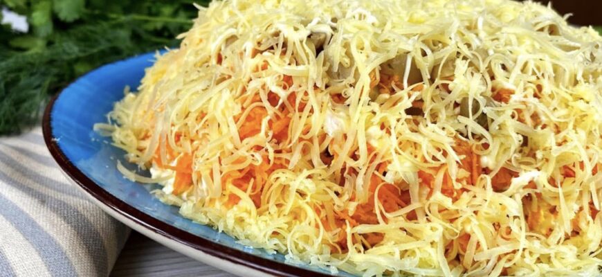 Після цього нарізаю мариновані печериці кубиком, викладаю поверх моркви і додаю легку сіточку майонезу. Завершую салат тонким шаром натертого на дрібній тертці сиру — його потрібно небагато, щоб утворилася легка «шапочка». Верх я не змащую майонезом, салат і так виглядає дуже апетитно та ніжно. Смачного!