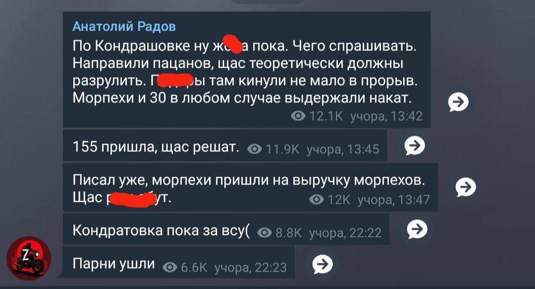 Більш відверті оцінки пропонують інші пропагандистські канали. Так, Z-ресурс “Північний канал”, пов’язаний із ЗС РФ, фактично анонсував швидкий розгром російського угруповання під Кондратівкою. За його даними, окупанти на цій ділянці фактично залишилися без підтримки.