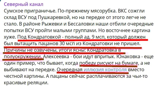 “Сумське приграниччя. Як і раніше м’ясорубка… Під Кондратівкою – повне пекло. 9-й МСП, який мав витягнути пацанів 30-го МСП із Кондратівки, не прийшов. Причини не озвучені, підсумки зрозумілі: Кондратівка в півокруженні”, – написав Z-канал.