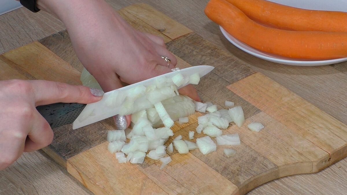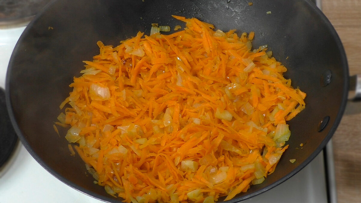 Цибулю нарізаємо кубиками, моркву натираємо на великій тертці. Беремо глибоку сковороду, казан, вок або каструлю з товстим дном.