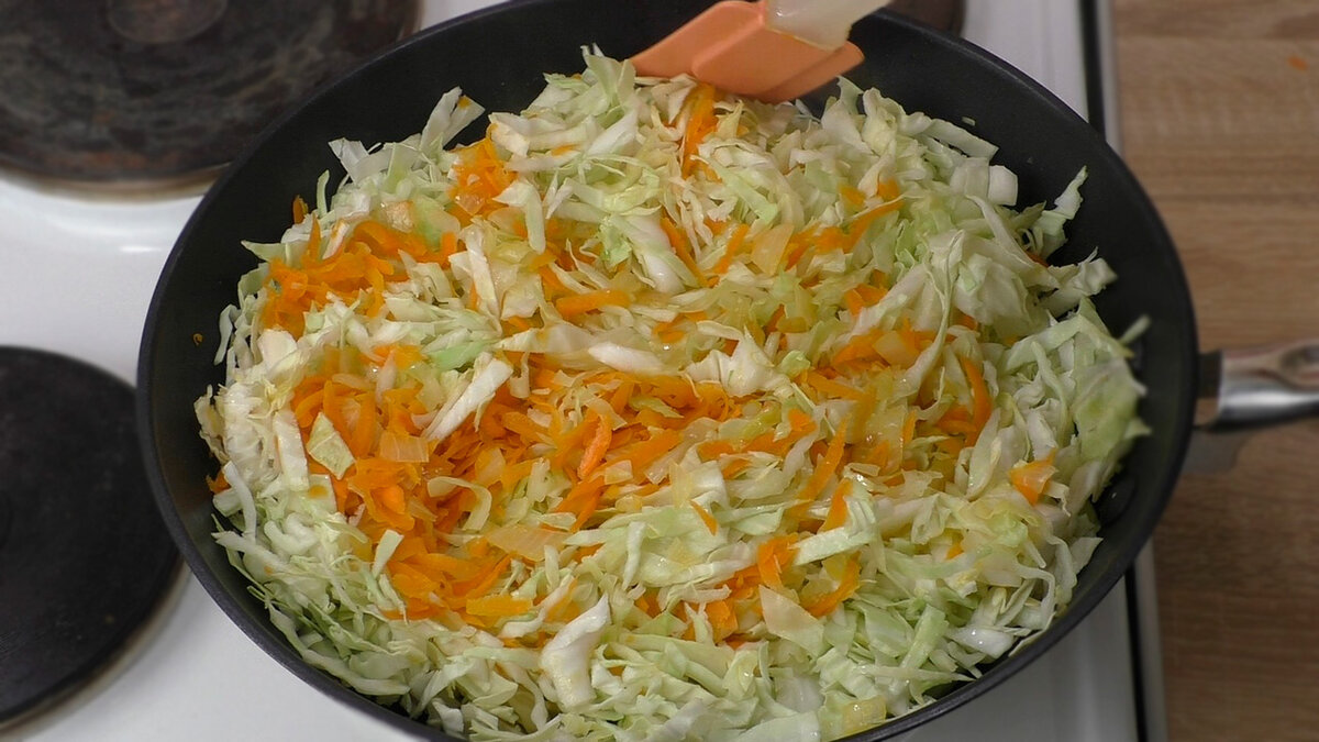 Коли морква з цибулею готова, додаємо 50 мл окропу і відправляємо сюди капусту. Перемішуємо.