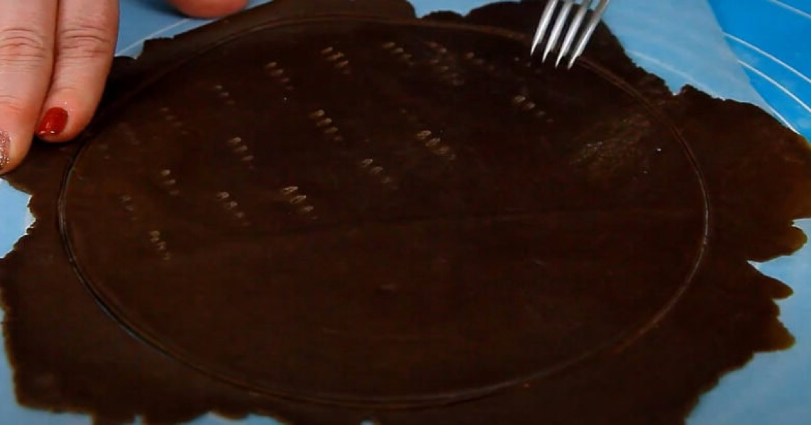Поділяю тісто на 8-9 шматочків, формую кульки, розгойдую на пергаменті в круглі пласти. Обрізаю за допомогою форми діаметром 20 см. Обрізки випікатиму разом з коржами, потім перетворю на крихту для прикраси. Наколюю коржі виделкою.