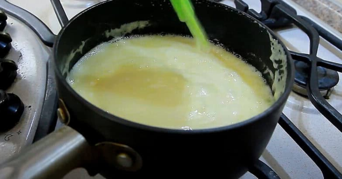У каструлі кипляче молоко. В окремій мисці змішую віночком яйця з цукром та ванільним цукром. Тоді додаю крохмаль, перемішую. Вливаю частинами кипляче молоко і перемішую. Перекладаю масу назад у каструлю, постійно помішуючи, доводжу заварну масу до загусання.