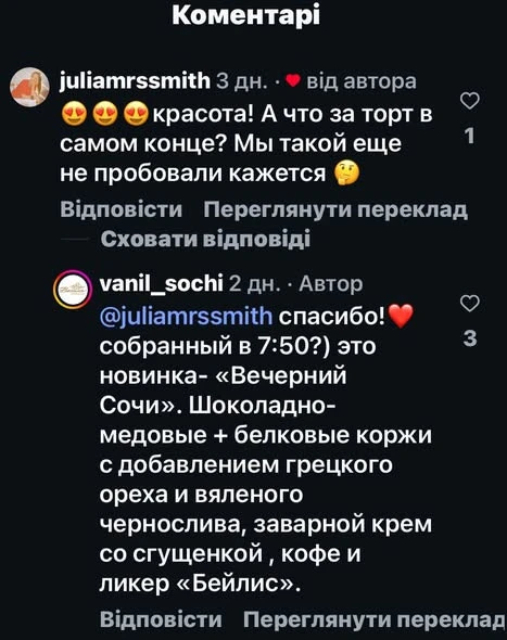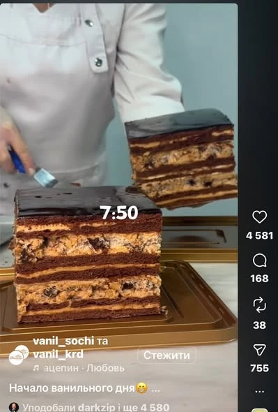 Російська пекарня в Сочі виклала відео у Reels, на якому з’явилась, за їхніми словами, “новинка” – торт “Вечірній Сочі”. Він повторює рецепт пляцка “Старий Львів” авторства Лесі Кравецької.