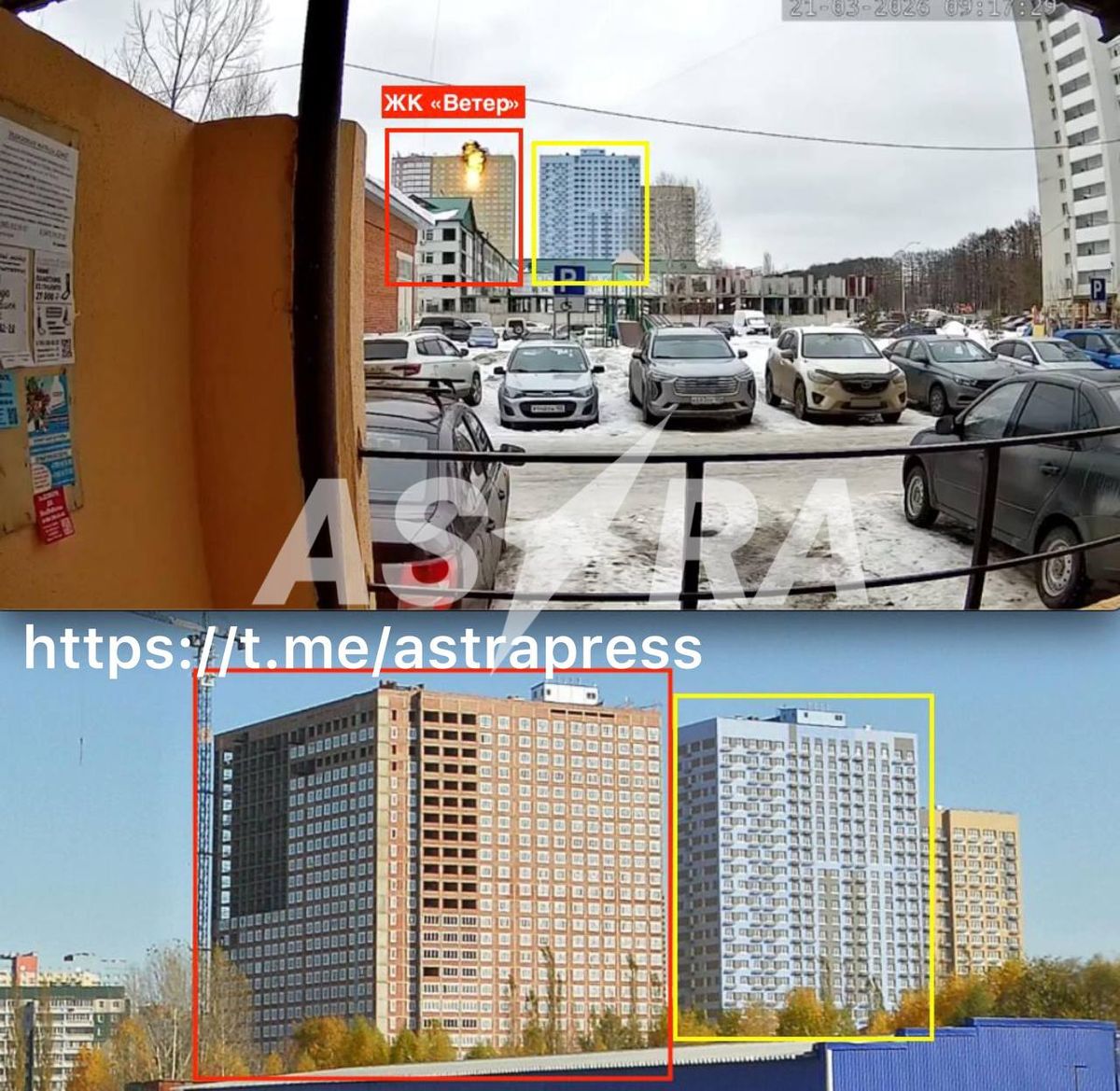 У російській Уфі під час атаки безпілотників зафіксовано влучання у недобудований багатоповерховий будинок у мікрорайоні Затон. За словами очевидців, пролунали вибухи, після чого на верхніх поверхах виникла пожежа – загорівся дах і пошкоджено фасад будівлі.