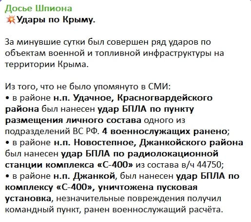 Ще один удар був зафіксований у районі Джанкоя. БПЛА вразили комплекс “С-400”: пускову установку було знищено, командний пункт отримав незначні пошкодження, одного військовослужбовця розрахунку було поранено.