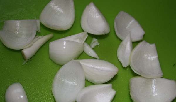 Цибулю поділити на 4 частини та розділити на пелюстки. Додати до м’яса.