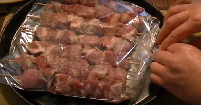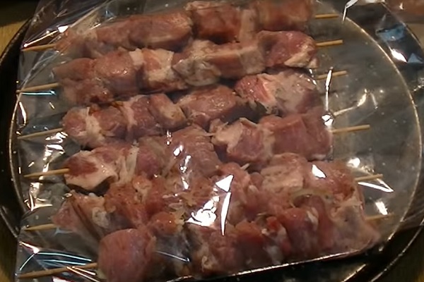 Помістіть шпажки з м’ясом в рукав для запікання. Укладайте шашлик в ряд, щоб дати йому можливість рівномірно прожаритися з усіх боків.