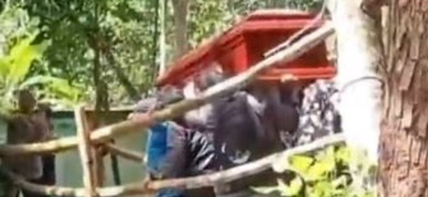 На кадрах видно, як процесія обережно рухається хитким дерев’яним мостом. У якийсь момент він різко просідає з одного боку — і люди разом із труною падають у річку.
