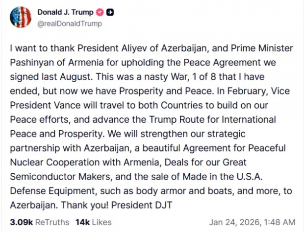 У своєму дописі Дональд Трамп нагадав, що між Вірменією та Азербайджаном «була жахлива війна», і зазначив, що це «одна з восьми війн», які він нібито закінчив.