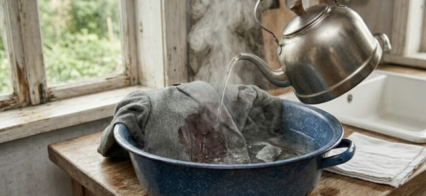 Але з цим лайфхаком будьте обережні, бо окріп підходить не для всіх тканин. Натуральна бавовна і льон переносять його добре. А от ніжні тканини від окропу можуть деформуватися, сісти або втратити форму (шовк, віскоза, вовна, делікатний трикотаж ). Перед тим як лити гарячу воду, перевірте склад тканини на етикетці. Якщо там є позначка “делікатне прання” або “не прати гарячою водою” – окріп категорично не підходить.