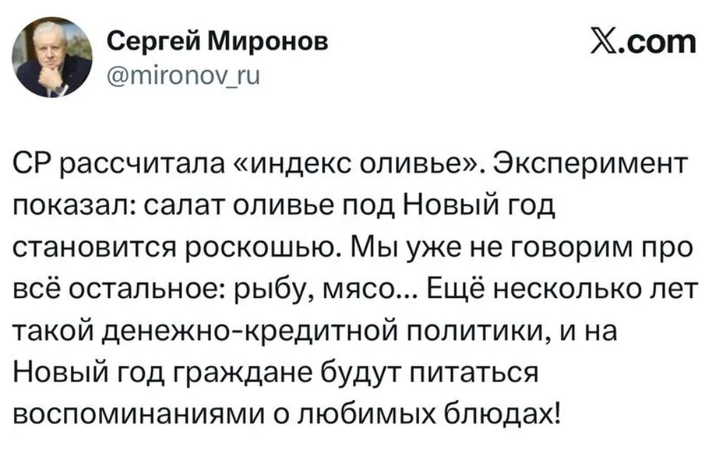 У цьому ж посту Миронов нарік: якщо нинішня кредитно-грошова політика в РФ збережеться ще кілька років, то росіянам доведеться остаточно забути про новорічні страви і жити лише одними спогадами.